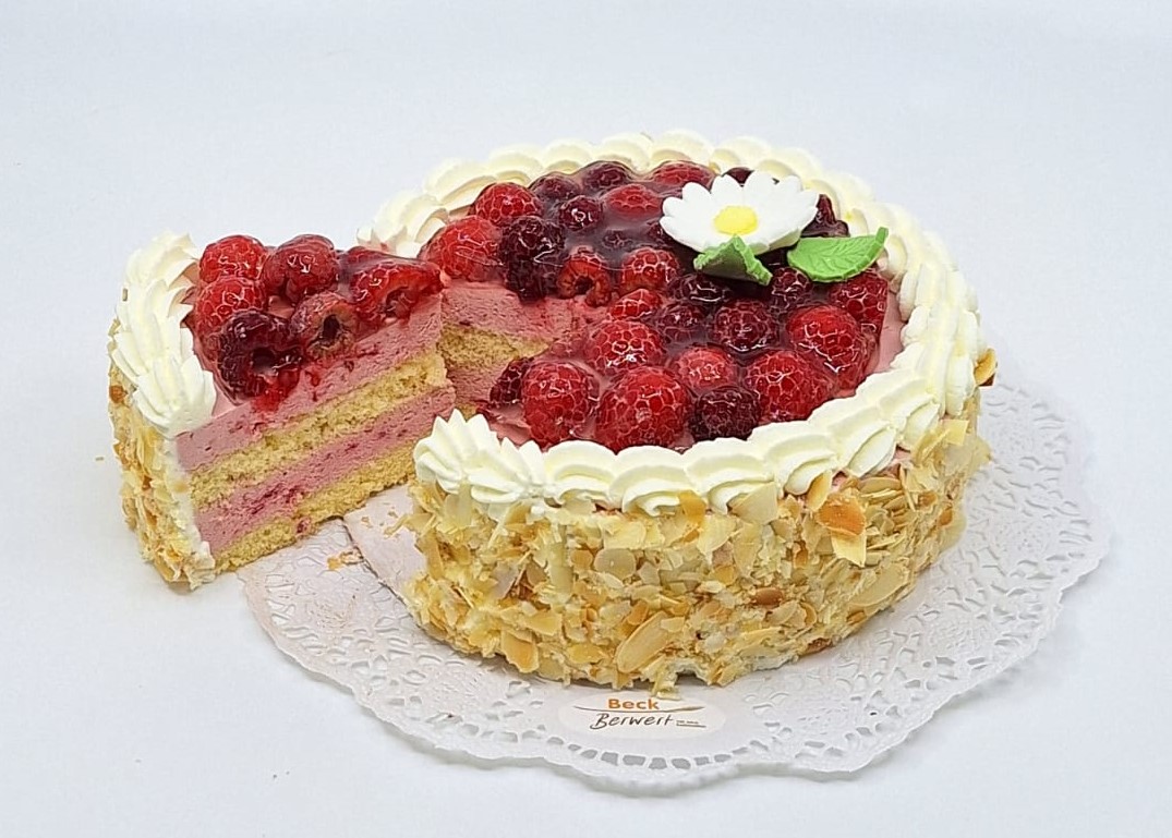 VOLLRAHM, Zucker, JOGURT 11%, saisonale Früchte 10%, Wasser, Gelee (Glukosesirup, Wasser, Geliermittel (Pektin, Natriumalginat, Carrageen)), WEIZENMEHL, EIGELB pasteurisiert, VOLLEI pasteurisiert, EIWEISS pasteurisiert, Himbeer Marmelade, MANDELN, Pflanzliches Fett, Gelatine, Kakaomasse, Zitronensaft (enthält Sulfit), VOLLMILCH, BUTTER, Kakaobutter, Backtriebmittel (Dinatriumdiphosphat, Natriumhydrogencarbonat), VOLLMILCHPULVR, EIWEISSpulver, BUTTEReinfett, Aromen, Vanille, MANDELN, Kakao, Meersalz, Farbstoff (Azorubin), RAHMPulver, Emulgator (SOJAlecithin), MAGERMILCHpulver