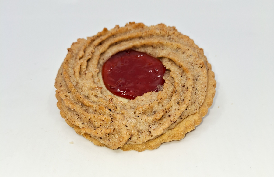 Himbeermarmelade: 15% (Zucker, Himbeeren 25%, Glukosesirup, Glukose, Wasser, Feuchthaltemittel (Sorbit), Geliermittel (Apfelpektin), Säuerungsmittel (Citronensäure), färbendes Lebensmittel (Konzentrate aus Süsskartoffel, Karotten, Apfel, Rettich und Kürbis), Himbeeraroma, Säureregulator (Natriumcitrat), Konservierungsstoff (Kaliumsorbat), Sonnenblumenöl, Festigungsmittel (Calciumcitrat), Stabilisator (Polyphosphate), Makronenmasse: HASELNÜSSE, Zucker, EIWEISS, WEIZENMEHL, Butter, Zucker, Kristall Natursalz